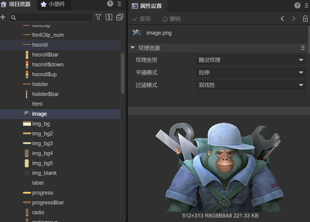 在 LayaAir3 IDE 中,选中一个纹理资源后,属性面板会显示纹理的参数配置区、大图预览窗口以及尺寸、格式等基础信息,如图 1-1 所示。