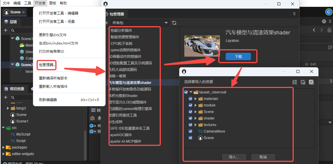 自 LayaAir 3.1 起,新增了插件系统及资源包的导入导出功能,3.2 版本进一步引入了包管理器。开发者可将外部工具、IDE 插件、项目资源或源码封装为完整的资源包,便于导入与共享,助力引擎生态的持续繁荣与扩展。