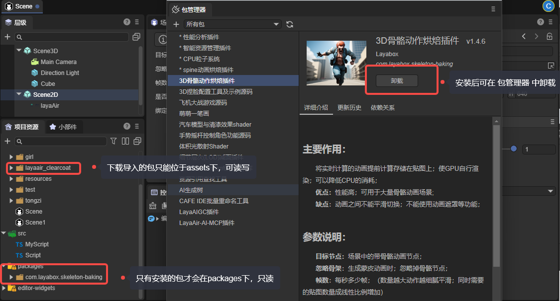 与下载导入的资源包只能位于assets目录下不同,安装后的资源包,位于packages下,分类与结构更清晰。