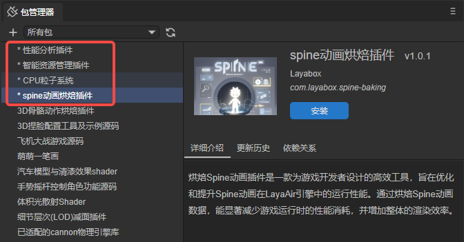 当前有:性能分析插件、智能资源管理插件、CPU粒子系统、Spine动画烘焙插件,后续会继续更新官方内置插件功能,以IDE包管理器中实际显示为准。