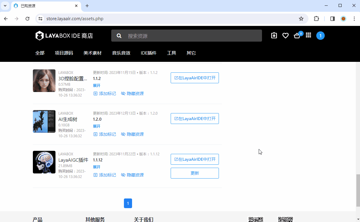 当我们在资源商店里将资源添加至我的资源后,可以在 已购资源 列表中找到,并点击 “在LayaAirIDE中打开”,如图2-1所示。