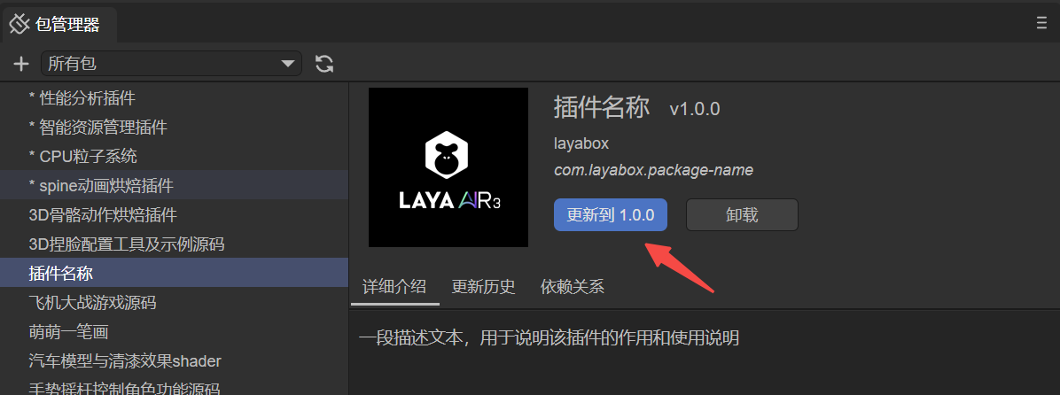 以“LayaAIGC插件”为例,开发者需要先查看更新日志内容,决定是否需要更新。