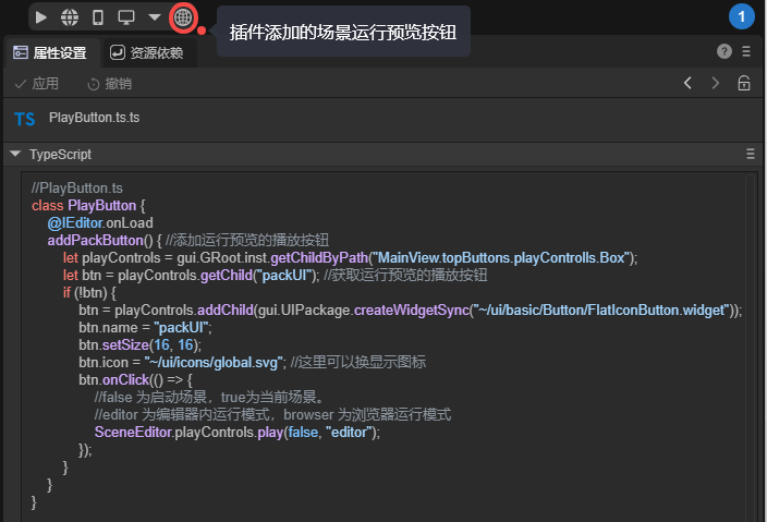 然后在保持 IDE 默认“预览当前场景”行为不变的情况下,用插件额外添加一个“以启动场景为入口运行”的按钮。效果如图 1-6 所示。