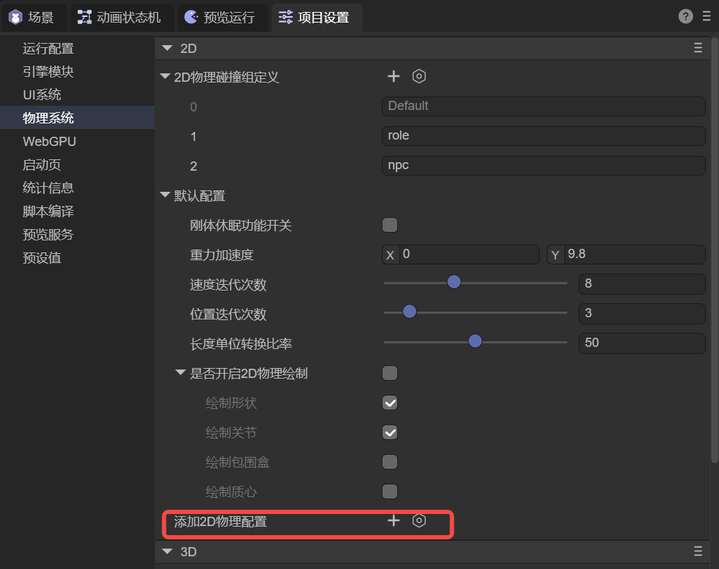 在 2D 物理设置界面底部,提供了 “添加 2D 物理配置” 入口,如图 1-2 所示。