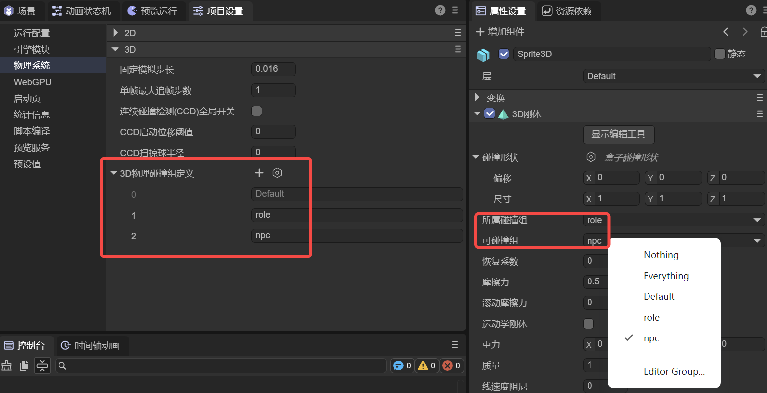 如图 1-1 所示,开发者可以在碰撞组定义中添加两个分组,例如 role 与 npc,并为角色对象的刚体碰撞形状设置: